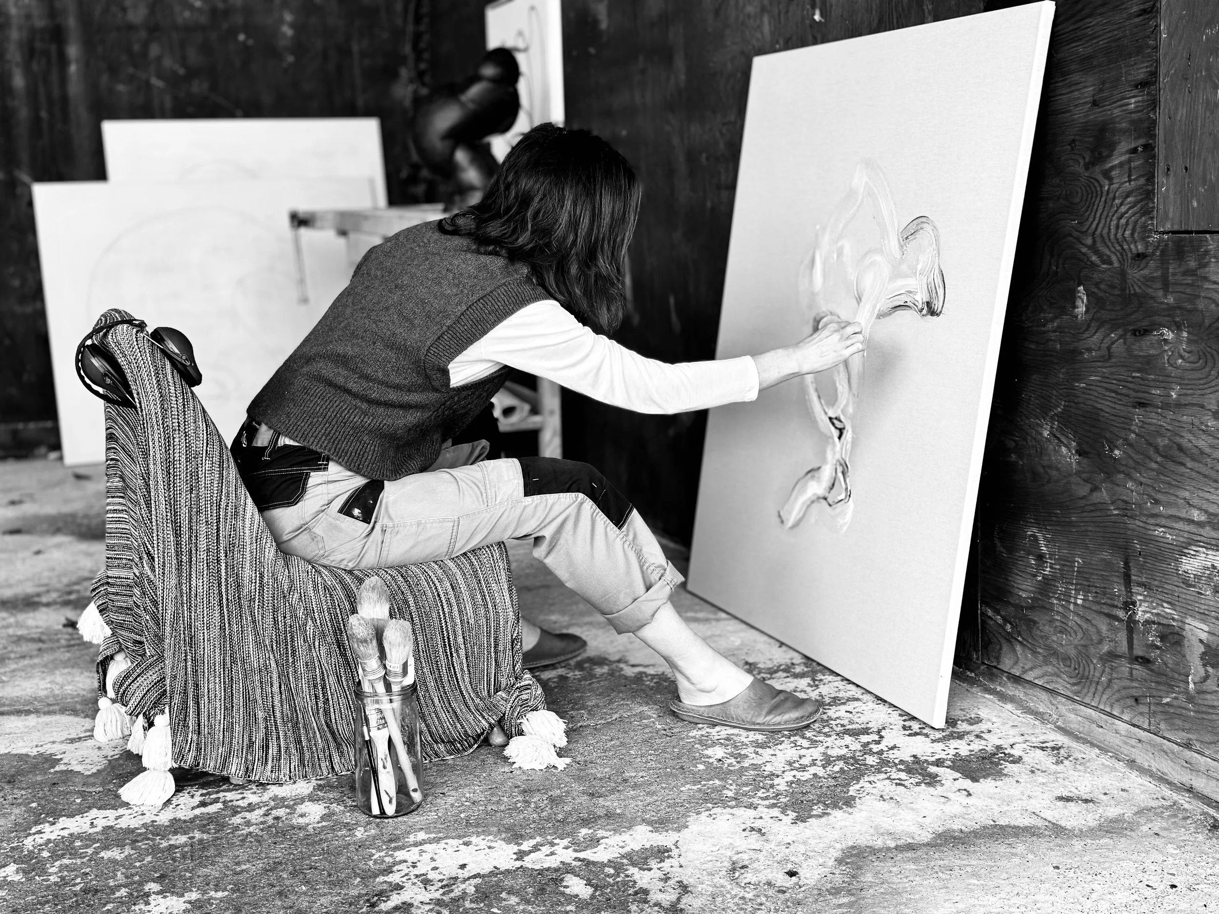 Allen's experimentation with colour and light adds a rich, multidimensional quality to her work. Highly polished bronzes encourage light-shapes to travel across the surface and reflect the colour and shadows around them. Gradient and transparent patinas allow for the innate quality of bronze to shine through. This deep connection to the material continues in drawing and painting with scratchy, and shakey ink lines on paper; thick, fast strokes, smooshes and sweeps of multilayered oil paint on raw canvas.